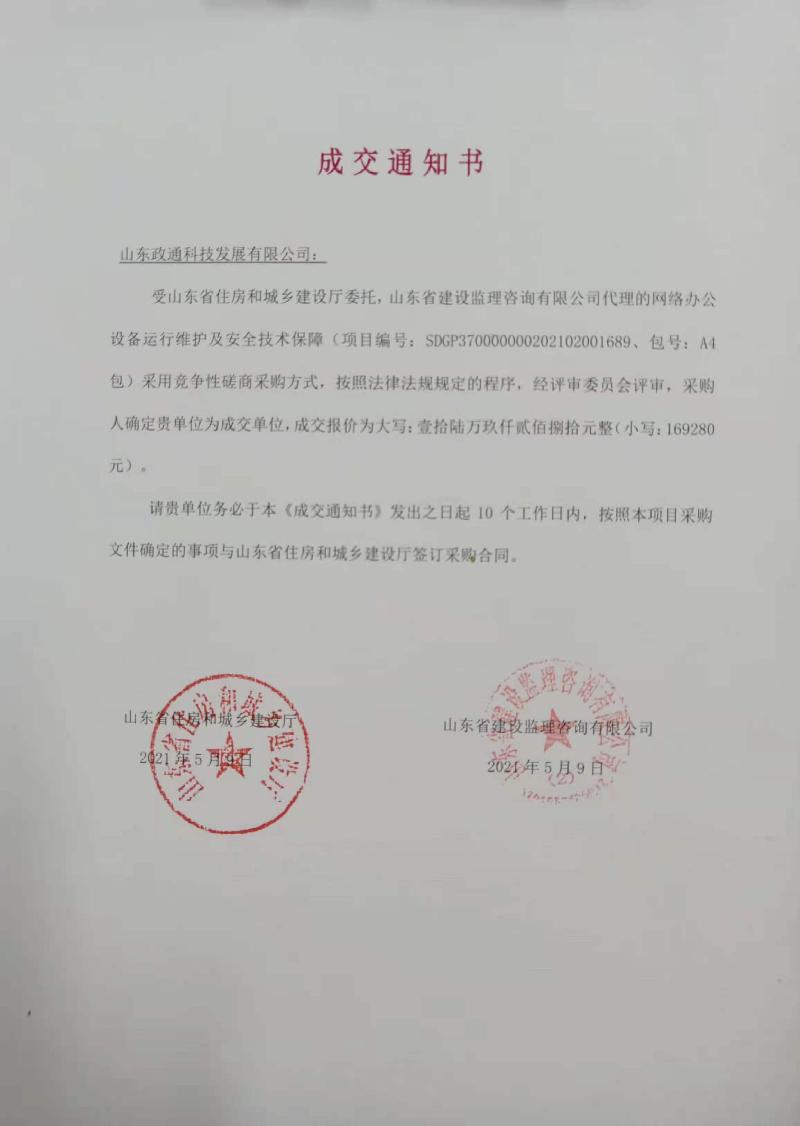 山东省住房和城乡建设厅住建综合服务显示屏项目中标通知